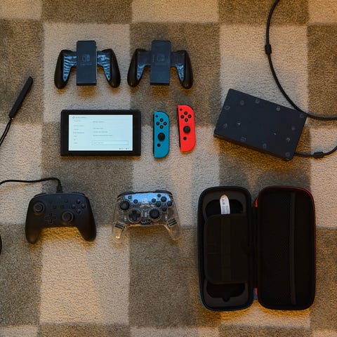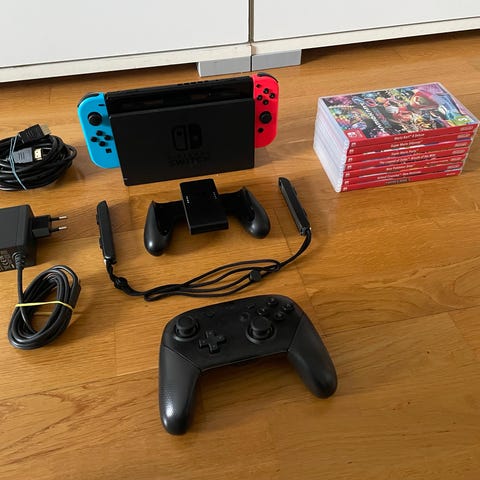 Mycket fin Nintendo Switch spelkonsol med dockningsstation och Joy-Con‑handkontroller i färgerna neon röd och neon blå. Paketet innehåller konsol, docka, Joy-Con vänster och höger, Joy-Con‑grepp, handledsremmar, strömadapter och HDMI‑kabel enligt bilder. På bilderna syns även fysiska spel till Nintendo Switch: Minecraft och Mario + Rabbids Kingdom Battle Gold Edition.