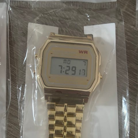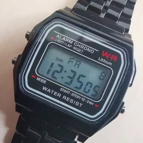 Casio-inspirerad digital klocka i retrostil med silverfärgat armband.