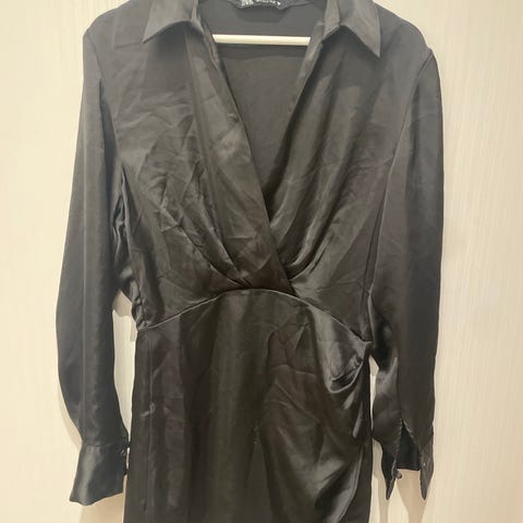 Zara party-/cocktailklänning för dam i storlek M. Klänningen är svart och tillverkad i polyester. Överdelen har spetsdetaljer och markerade kupor, medan nederdelen är slät och enkel. Dragkedja bak för stängning. Passar till fest- och kvällstillfällen.