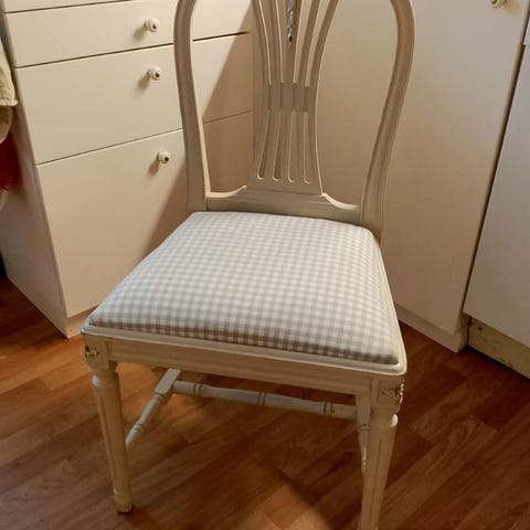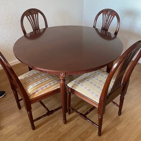 Matgrupp bestående med bord, 4 stolar och iläggskiva i brunt trä. Bordet är runt med dekorativa detaljer. Stolarna har stoppad sits med rosa och vitt mönstrat tyg och ryggstöd med klassisk spjäl och bågform. Passar som matgrupp i kök eller matsal. Iläggskiva är 55cm bred.