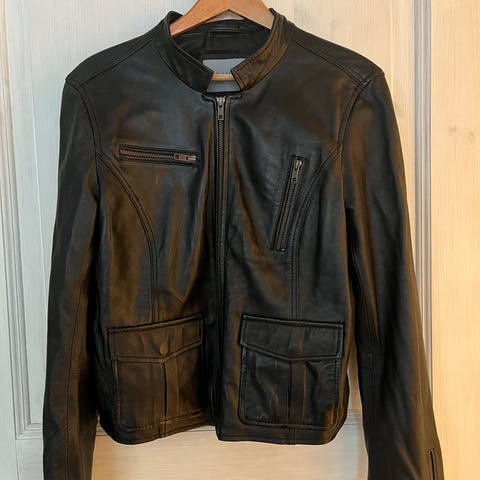Jättefin Selected Femme skinnjacka för dam i svart färg, storlek 38. Jackan är tillverkad i läder med slät yta och har dragkedja framtill. Modellen har långa ärmar, två framfickor med dragkedja samt justerbar detalj nedtill. Fodrad insida för ökad komfort. Passar som vardagsjacka eller ytterplagg under mildare väder. Rök- och djurfritt hem