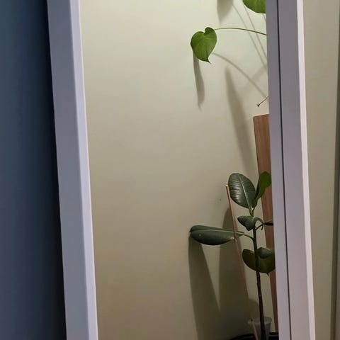 Ikea spegel för helkropp i vit ram. Monteras stående mot vägg eller upphängd beroende på beslag och önskemål. 40 x 150 cm.