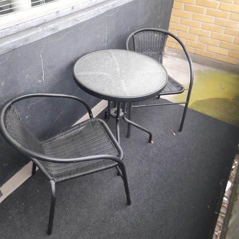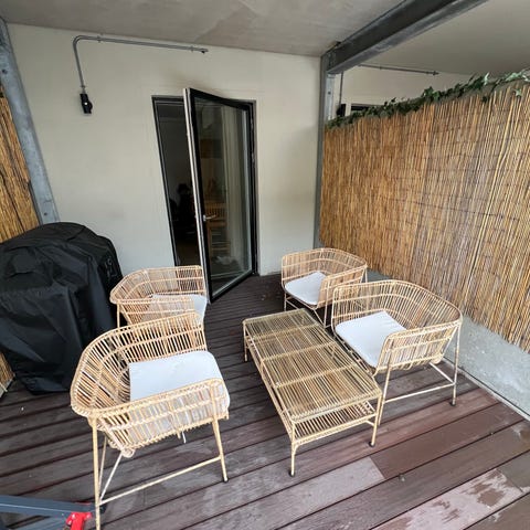 Stolarna i korg är inköpta på IKEA. Rejäla och i gott skick. Saknar dynor.