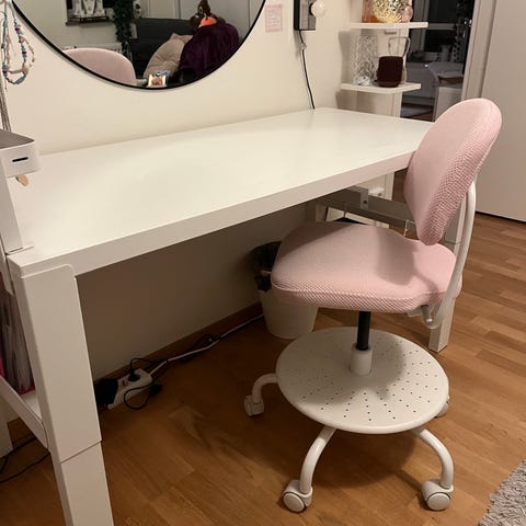 Ikea skrivbord med överhylla i vit färg. Skrivbordet har en arbetsyta med genomföring för kablar, en utdragbar låda samt ett skåp med dörr på sidan. Överdelen har hyllplan för förvaring av böcker och mindre saker. Passar till barn- eller tonårsrum som plats för läxläsning, pyssel eller datorarbete.