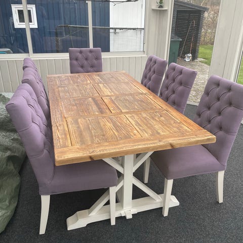 Matgrupp bestående av rektangulärt matbord i massiv ek och 8 stolar. Bordet har rak, stabil underredeskonstruktion med tvärslåar och en slät bordsskiva i brun träfinish. Stolarna har stegpinnerygg och sits med lösa, ljusa dynor. Passar som matgrupp i kök eller matrum för flera sittplatser runt bordet.