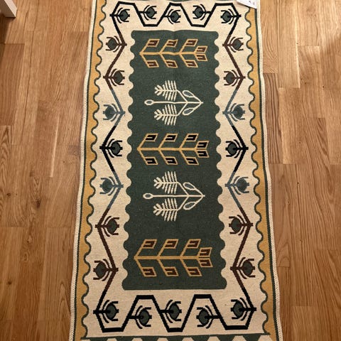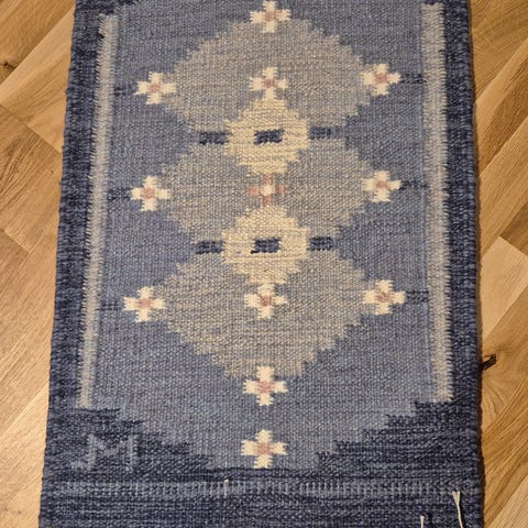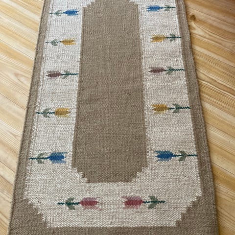 Säljer en vacker, handvävd matta i ull (troligtvis rölakan). Ljus botten med diskreta blommönster och dekorativa kanter. Mattan är i fint skick och ger en varm, ombonad känsla till rummet. Perfekt för hallen eller sovrummet.