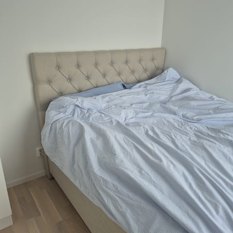 IKEA säng med stoppad sänggavel i grått tyg. Sänggaveln är vadderad och har knapptuftad design. Sängen har vit sängram och är lämplig som dubbelsäng. Passar i sovrum där man önskar en enkel och neutral säng med mjuk gavel att luta sig mot vid läsning eller vila.
