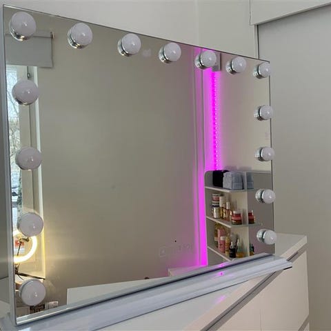 Hollywoodspegel köpt för cirka 1 800kr, inga märkbara defekter. Finns tre ljusinställningar, neutralt, varmt och kallt ljus och har även högtalare så det går att lyssna på ex. musik! Går både att skruva upp på väggen eller att ha ståendes med ett stöd som följer med.