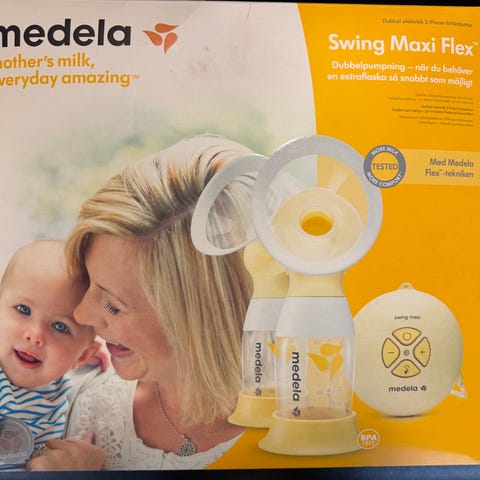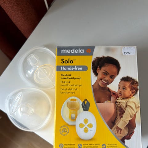 Medela Solo elektrisk bröstpump med flaskor och tillbehör. En kompakt elektrisk bröstpump med pumpenhet, slang, tratt, två bröstmjölksflaskor med lock samt USB-kabel för laddning.