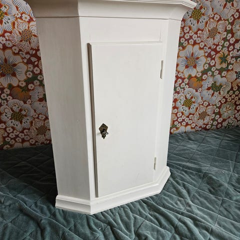 Hörnskåp i trä med vitmålad yta. Skåpet har ett övre skåp med dörr och ett nedre skåp med två hyllplan som ger förvaringsutrymme. Utformat för att stå i ett hörn och utnyttja rummet effektivt. Passar för förvaring av porslin, prydnader eller andra hushållsartiklar i exempelvis vardagsrum eller kök.