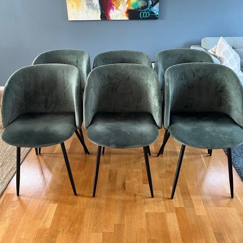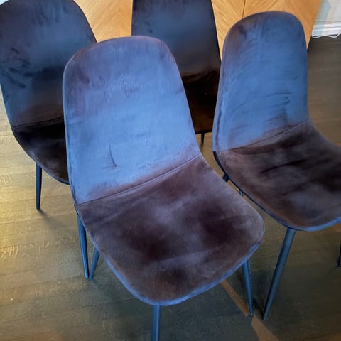 Mio stol i grå sammet med metallben. Sits och rygg är lätt rundade för ökad komfort. Klädseln är i ett sammetsliknande tyg i mörkgrå ton och benen är smala i metall, troligen lackerade i mörk färg.. Passar som matstol eller extra sittplats i vardagsrum eller arbetsrum.