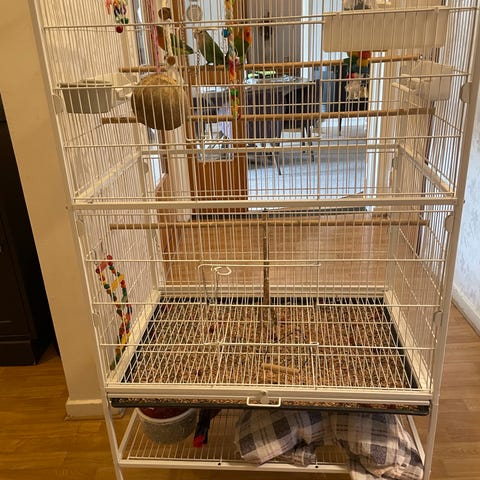 Egen byggd fågelbur. Den är 150 cm × 150 cm × 150 cm, storlek på maskor 19 mm, så fungerar ej till de mlnsta fåglarna. Den har en stor dörr så att man enkelt kan gå in och ut. Den saknar golv, jag har endast använt den med en vaxduk under vilket fungerat jättebra. Kan användas både ute och inomhus. Jag kommer vara tvungen att plocka ner den i sektioner så att den går att bära ut/frakta. Hör av dig om du har några frågor.