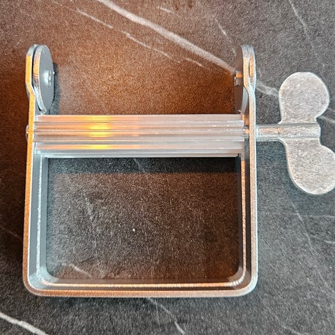 Metall hållare för tuber i silverfärg. Passar för att rulla upp och tömma tuber, till exempel tandkräm, krämer eller liknande produkter. Hållaren har en vev på sidan för att enkelt pressa ut innehållet ur tuben och en öppning där tubens ände träs in. Tillverkad i metall med kompakt format som är lätt att förvara i badrum eller kök.