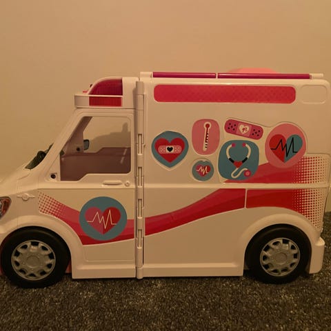 Barbie husbil leksaksfordon i rosa plast. Husbilen kan öppnas upp och fällas ut till en lekplats med bland annat sittplatser, köksdel, badrum och sovdel. På sidan finns en utfällbar pool och trappa. Passar för lek med Barbie-dockor och liknande dockor i liknande storlek. Lämplig som rollleksleksak inomhus.