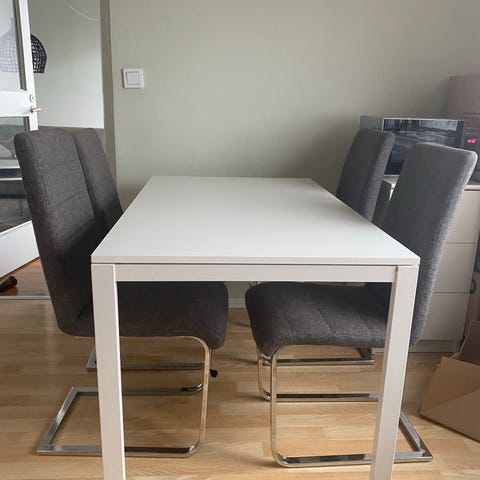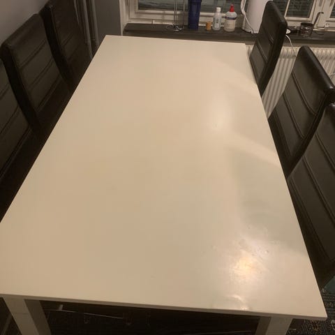 högglansigt matbord har några kantstötningar på benen och litet vid kanten av bordsskivan men inget som stör funktionen