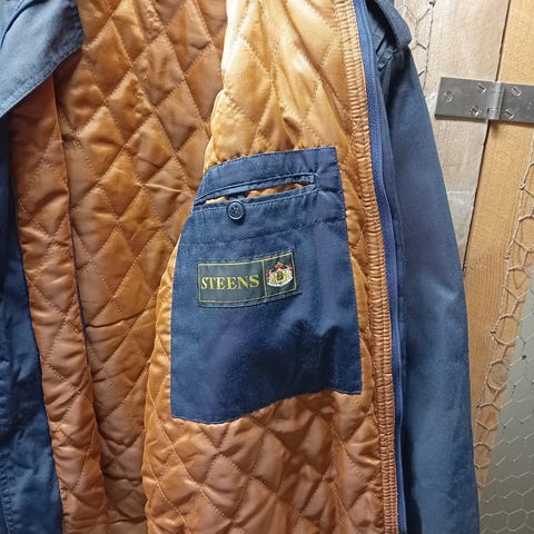 Herr jacka i ljusbrun mocka med sidenliknande innertyg i mörkblå färg med innerficka på vänster sida.