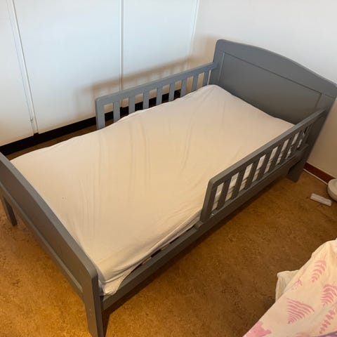 Jollyroom juniorsäng i rosa plast. Sängen har skyddande sidor och låg höjd anpassad för barn som gått över från spjälsäng till vanlig säng. Materialet är plast med ben i kontrasterande färg. Passar standardmadrass för juniorsäng (mått ej angivet). Lämplig för användning i barnrum som övergångssäng mellan spjälsäng och fullstor säng.