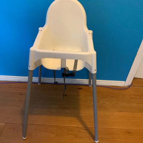 IKEA barnmatstol i vit plast med löstagbara ben. Stolen är avsedd för små barn vid matbordet. Sitsen har inbyggt bord och säkerhetsbälte. Benen är i metall med plastfötter. Passar för inomhusbruk vid matplats eller kök.