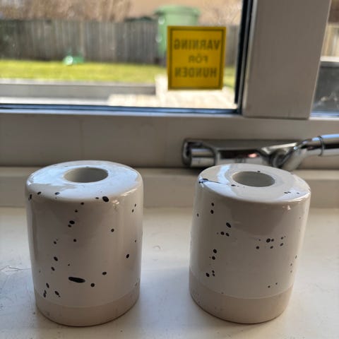 Vita ljusstakar i gips avsedda för värmeljus