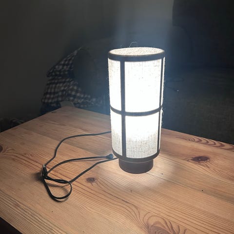 Bordslampa med cylinderformad, vit strukturerad lampskärm I keramik. Konformad svart fot. Lampan är eldriven med sladd och ger ett varmt, gult sken när den är tänd. Passar för placering i fönster, på bord eller hylla som stämnings- eller läsbelysning i hemmet.