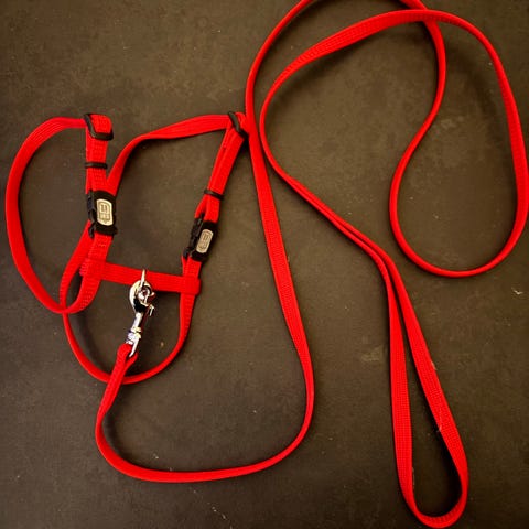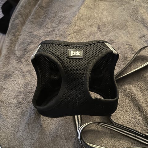 Svart sele med koppel för kattunge. Selet har justerbara remmar och spännen för att kunna anpassas efter kattens storlek. Kopplet är fastsatt i selet med metallhake och liten bjällra. Passar för promenader och vardagsbruk.