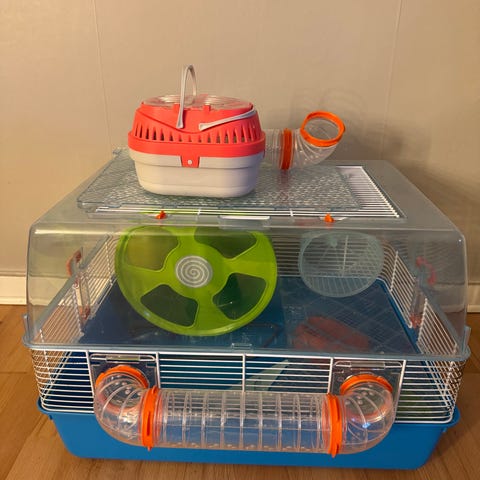 Smådjursbur med plastbotten och galleröverdel i metall. Burens botten är turkos och gallret är vitt. I buren ingår löphjul, vattenflaska och några enkla tillbehör som passar för mindre gnagare som hamster eller mus. Lämplig som inomhusbur för små sällskapsdjur. Storlek: Bredd 45 cm, höjd 28 cm och djup 30 cm.