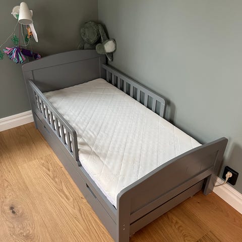 Fin juniorsäng från Bloomingville med fina detaljer. Sängen har ett skydd på sidan som gör att barnet inte ska rulla ut ur sängen, skyddet är i form av ett moln. Skyddet går att sätta på båda sidor av sängen och går att ta av helt. Tillverkad i MDF och trä. Mått L200 x H70, 5 x B90 cm.