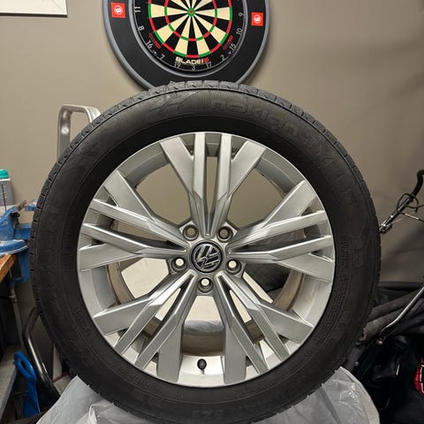 Fälgarna är i fint skick utan större skador. Däcken har bra mönster kvar och är redo att användas.