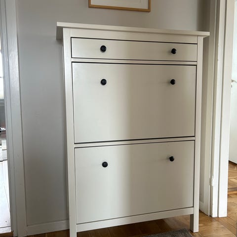 Får plats med 14 par skor. Har en liten låda ovanpå för förvaring av t ex nycklar, solglasögon. Fint skick utanpå. Ser mer använt ut inuti som eftersom det varit skor i den.