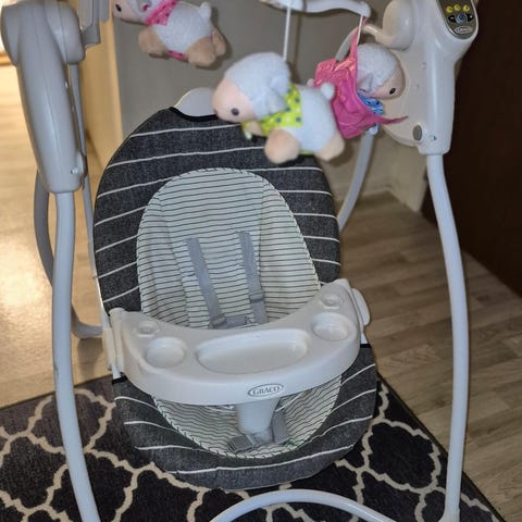 Vi säljer en babygunga eftersom han inte längre behöver den. Den fungerar och kan slås på med fjärrkontroll eller manuellt. Den har olika gungfunktioner.