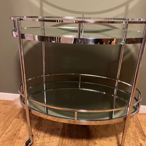 Drink- och serveringsvagn med glashyllor i olika nivåer.