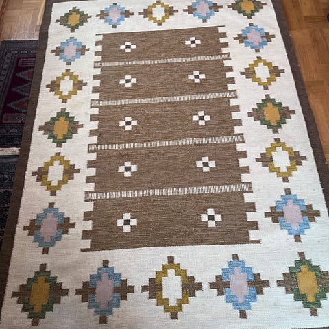 UllMatta I patchworkstil använd under någon månad tills jag hittade en som passade bättre till min inredning. Men skulle passa perfekt i ett lugnt/svalt rum eller som en statement piece i ett varmare rum