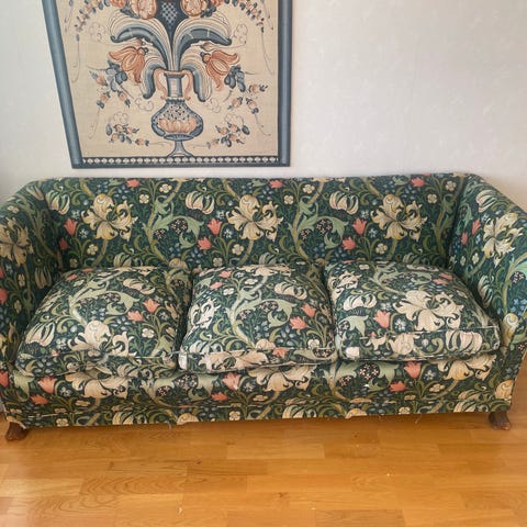 Soffan är hel men det finns missfärgning på armstödet. Men med lite möbeltvätt borde det går bort