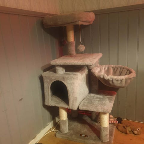 Sov- och lekplats med klöspelare att vässa klorna på.