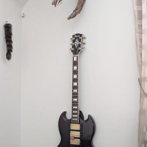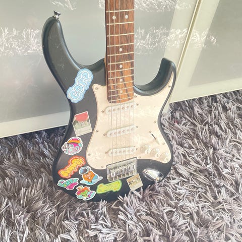 Elgitarr från Silvertone i svart färg. Gitarren har en vit plektrumskydd och tre single-coil pickuper. Den har sex strängar och stämskruvar i krom. En svart gitarrrem medföljer.