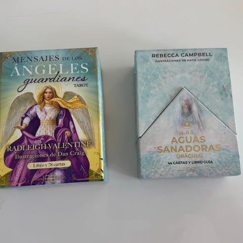 De fyra på en bild är Sacred Earth Oracle, Änglaterapi orakelkort, Energy Oracle Cards och Animal Tarot Cards. Pris: 150 kr styck eller 400 kr om du köper alla fyra.
