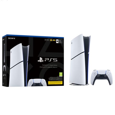 Sony Playstation 5 spelkonsol i vit färg. Medföljande handkontroll är en DualSense trådlös handkontroll i vitt och svart.
