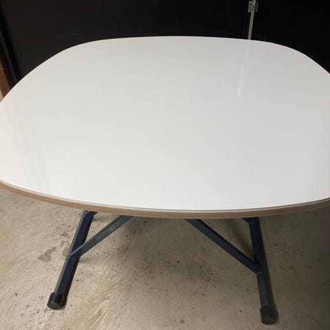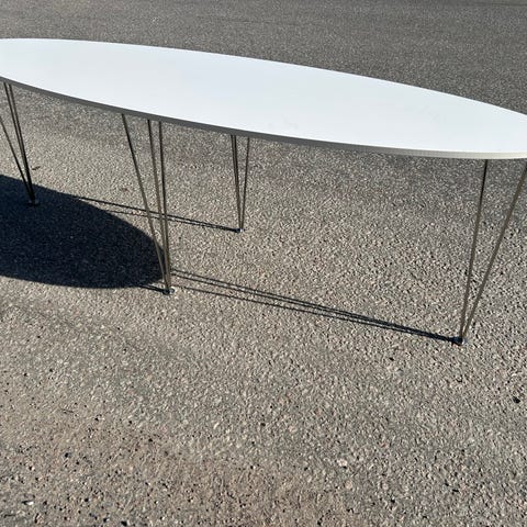 Elipsformat matbord från IKEA. Högblank vit skiva. Stomme i metall. Passar även som ett exklusivare konferensbord.