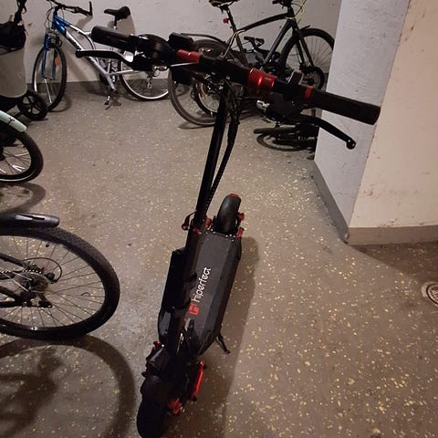 Den är fem år gammal och ett utav armstöden har gått av lite längst fram, korgen är lite sned och den behöver rengöras. Inget som stör funktionen alls. Styret kan gå ner ända ner och man får därför inte ont i armar eller axlar som med andra scootrar och styret går också att reglera och sätta fast längre upp som på bilden om man vill.
