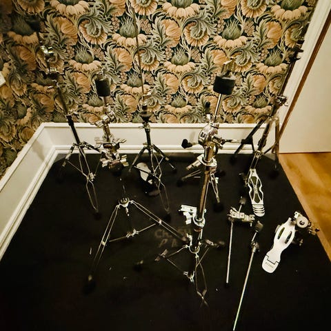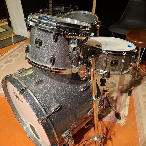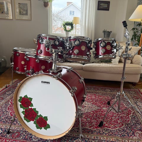 Bastrumman låter fett och stort. Skinnen är dags att byta på hängpukorna, men de låter ändå relativt bra.