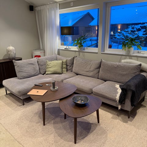 Säljer vår gråa soffa med divan och nackstöd. Den är 3m bred, 80cm djup och divanen är 115cm djup. Bra skick och varsamt använd