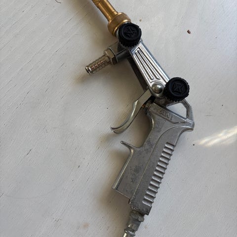 Tryckluftspistol med fast monterad hållare/fäste. Verktyget är avsett för anslutning till tryckluftssystem och kan användas i verkstad eller garage. Exakt märke, modell, storlek och material är okänt utifrån tillgänglig information.