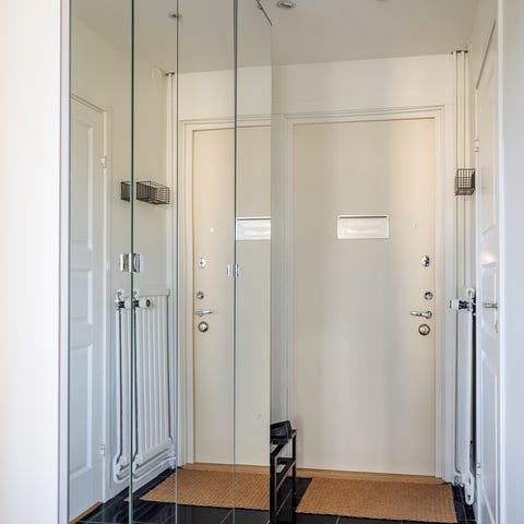 IKEA garderob med skjutdörrar i spegelglas. Garderoben har spegeldörrar i flera sektioner som täcker hela fronten, vilket ger god överblick och kan göra rummet ljusare. Stommen är i en ljus, neutral färg. Passar för förvaring av kläder, skor och andra textilier i sovrum eller hall.