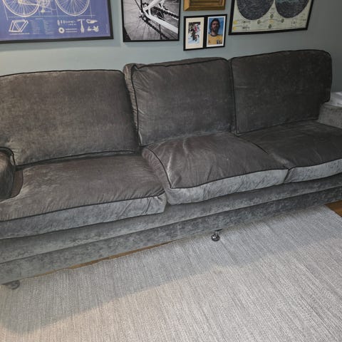 IKEA soffa skänkes mot upphämtning. Modellen verkar ha utgått men påminner om Söderhamn. Soffan har några fläckar i tyget på kuddarna som går att tvätta och ett av benen sitter något snett (inget som påverkar och borde gå att byta- se bild). Soffan har ett djup och höjd som gör den otroligt komfortabel.