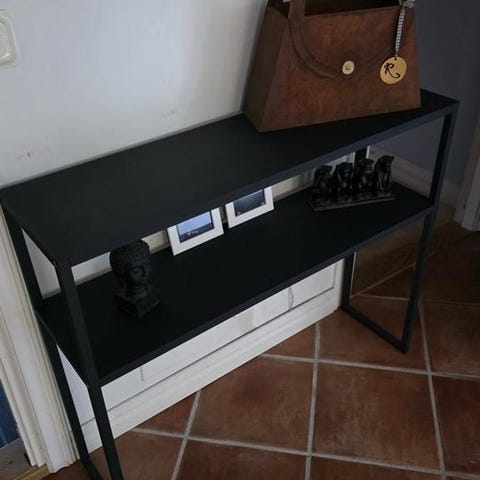 Svart konsolbord med två hyllplan i metall. Bordet har en smal och rektangulär form med öppen stomme och raka ben. Övre och undre hyllplanet ger plats för förvaring eller exponering av till exempel böcker, dekoration eller belysning. Passar i hall, vardagsrum eller som avlastningsbord längs en vägg.