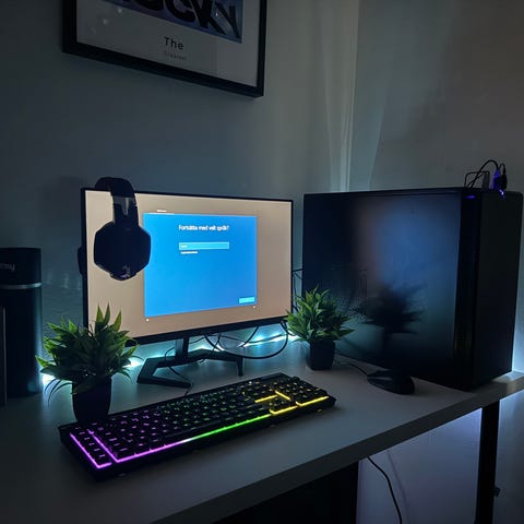 Asus stationär dator. Datorn är monterad i ett tornchassi och används tillsammans med extern skärm, tangentbord, mus och headset enligt bilderna. Exakta specifikationer som modellbeteckning, processor, minne, lagring och grafikkort framgår inte av underlaget och bör kontrolleras av köpare eller anges av säljare vid behov.