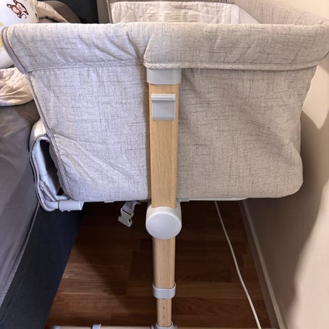 En bedside crib från märket JLY Dream Jollyroom. Sparsamt använd & använd med madrasskydd. Hjul ingår men går att använda utan. Några små färgskav på. Ej monterad.