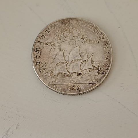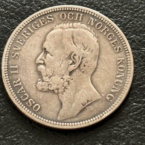 Svensk tvåkrona 1897 silvermynt. Myntet visar kunglig profil på ena sidan och riksvapen med texten "TVÅ KR" på den andra sidan. Präglingsår 1897 framgår längst ned. Myntet är av silver och lämpar sig som samlarobjekt eller för numismatiskt intresse.