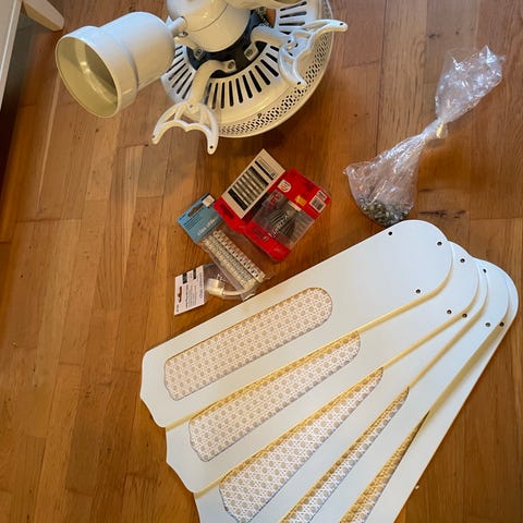 Takfläkt med belysning i vit färg. Modellen har fem fläktblad och flera lampskärmar runt en central ljuskälla. Fläkten monteras i tak och styrs med dragkedjor för både fläkt och ljus. Passar för allmänbelysning och luftcirkulation i inomhusmiljöer som vardagsrum, sovrum eller kök. Det sitter nästan nya lågenerglampor i armaraturen, kan provköra på plats.