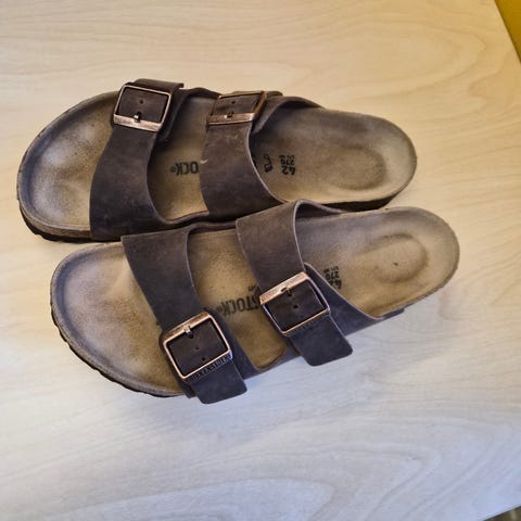 Birkenstock sandaler i storlek 36. Modellen har två justerbara remmar med spännen och en formad fotbädd. Färg: vit med brun fotbädd. Passar som vardagssandal eller innesko.